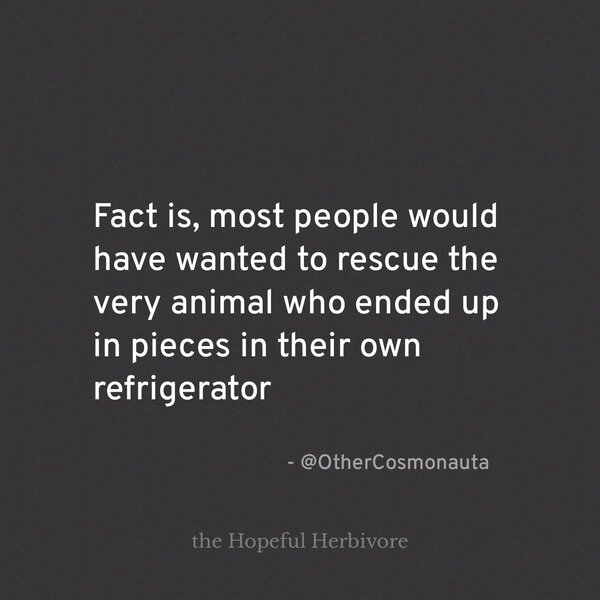 "Reality: If you came across a jumper -- an animal that beat the odds and escaped slaughter -- your first inclination would probably be to rescue, care for, and nurture that animal. You would likely care deeply. And you know that. And the fact that your choices don't align with that makes you uncomfy. That's called cognitive dissonance. Really being introspective and changing takes courage. But we see people do it every day." --The Hopeful Herbivore https://www.facebook.com/share/p/1DZaUGhQG6/